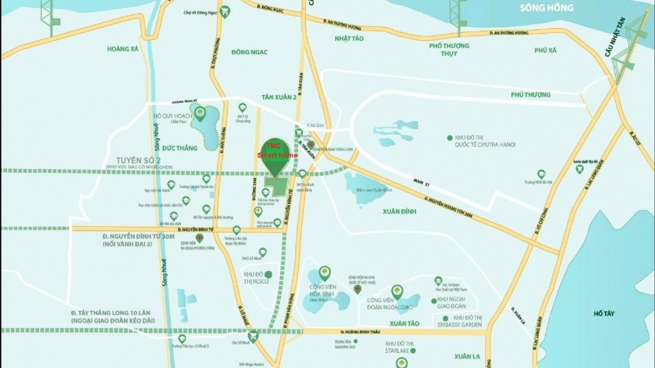 Ưu điểm "Vàng" (Vị trí & Giá): TMC Smart Home tọa lạc tại vị trí "cửa ngõ" của KĐT Tây Hồ Tây (thuộc KĐT Bắc Cổ Nhuế - Chèm). Vị trí này kết nối trực tiếp vào lõi Starlake thông qua các trục đường quy hoạch huyết mạch như Tây Thăng Long và Nguyễn Hoàng Tôn kéo dài.